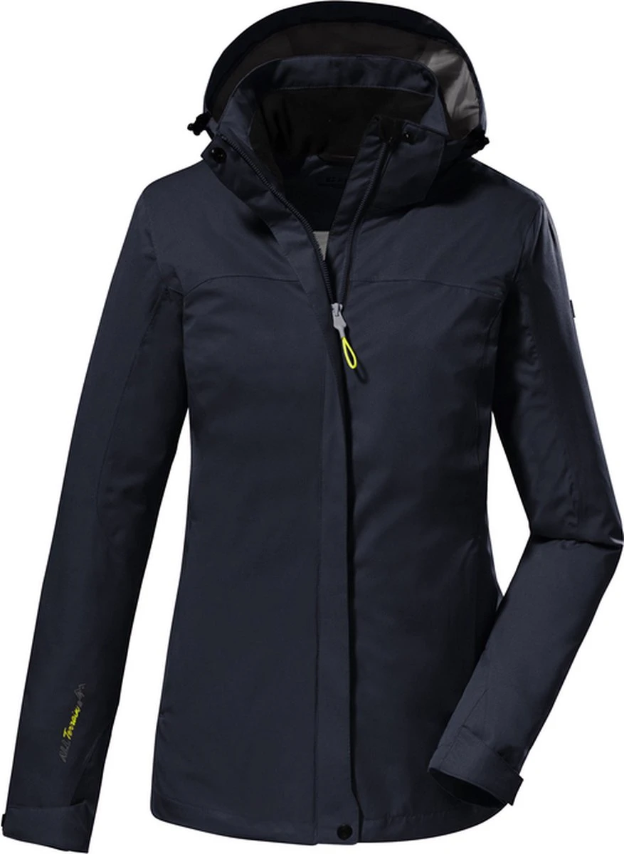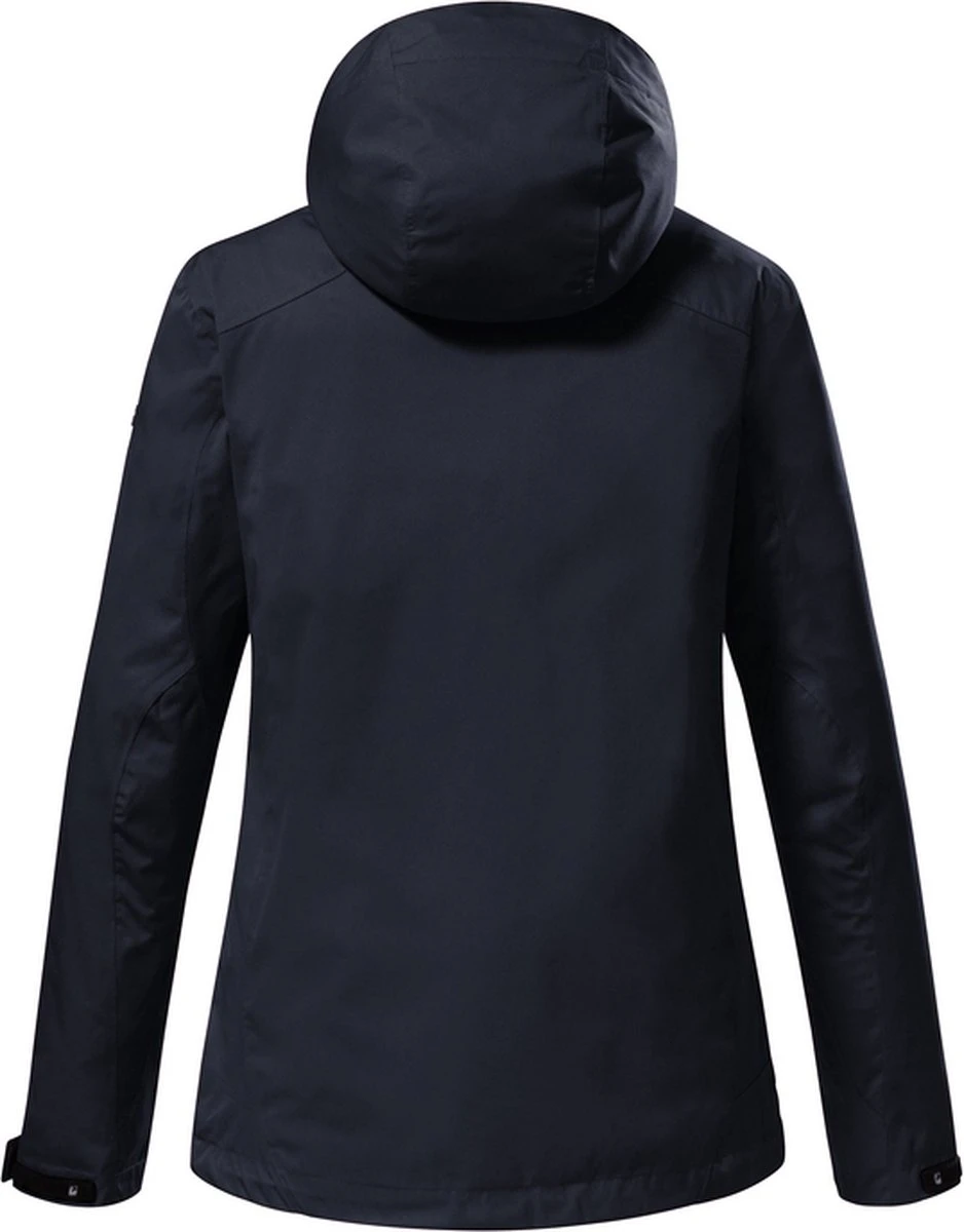 Functionele dames zomerjas van Killtec. Model: 38383. Kleur donkerblauw. Functionele zomerjas, winddicht, waterdicht, waterkollom 10.000. Getapte naden en ademend. Afritsbare capuchon. Gemaatk van 100% polyester.