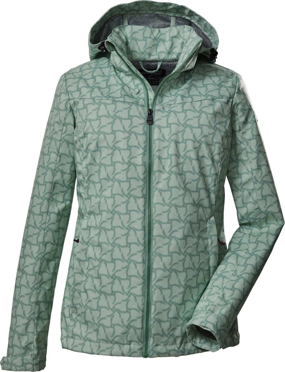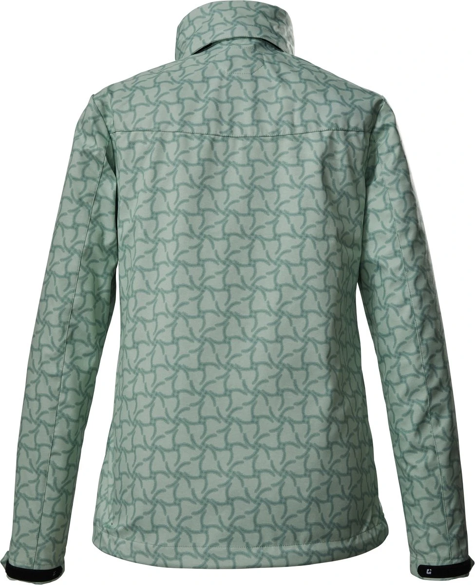 Trendy dames softshell jas van Killtec. Model: 39140. Kleur: lichtgroen (pistache). Mooie softshell jas met print. Gemaakt van 100% polyester. Winddicht, waterafstotend, waterkollom 10.000, ademend.