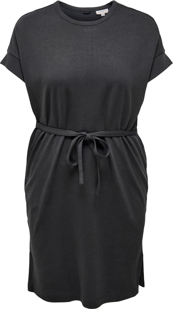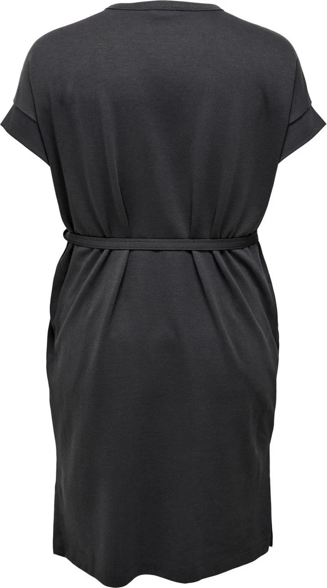 Effen zwarte jurk met ceintuur om de middel. Korte mouwen die mooi afgewerkt zijn. Deze jurk heeft een ronde hals. Door de kleur is deze perfect te combineren met allerlei kleuren.