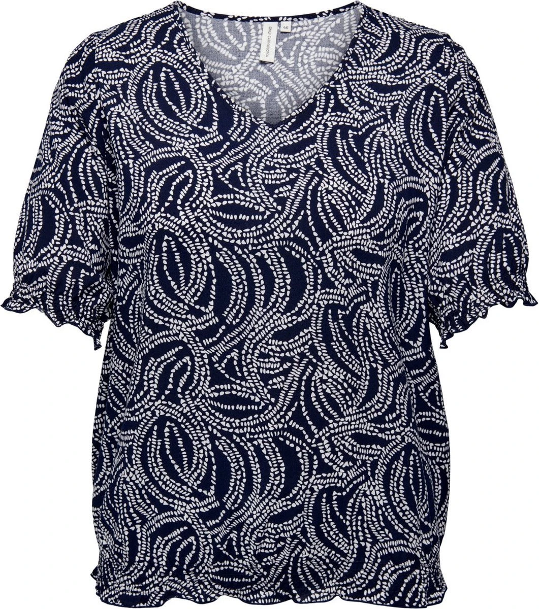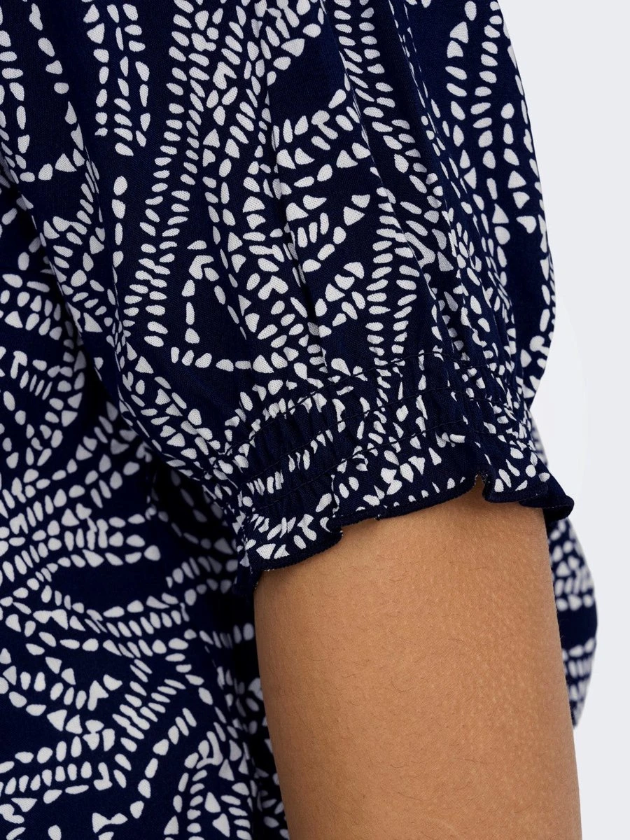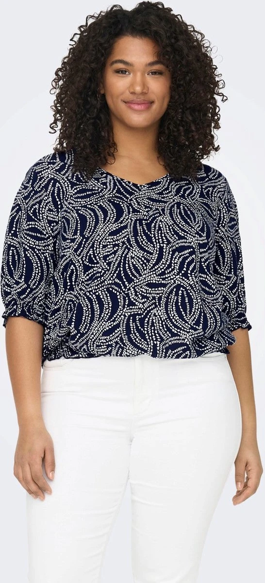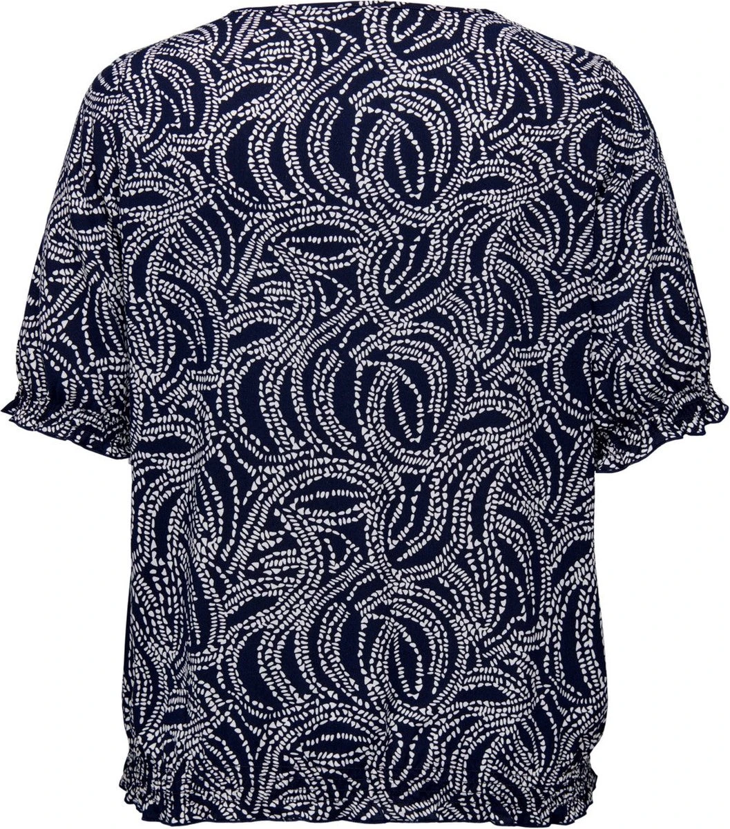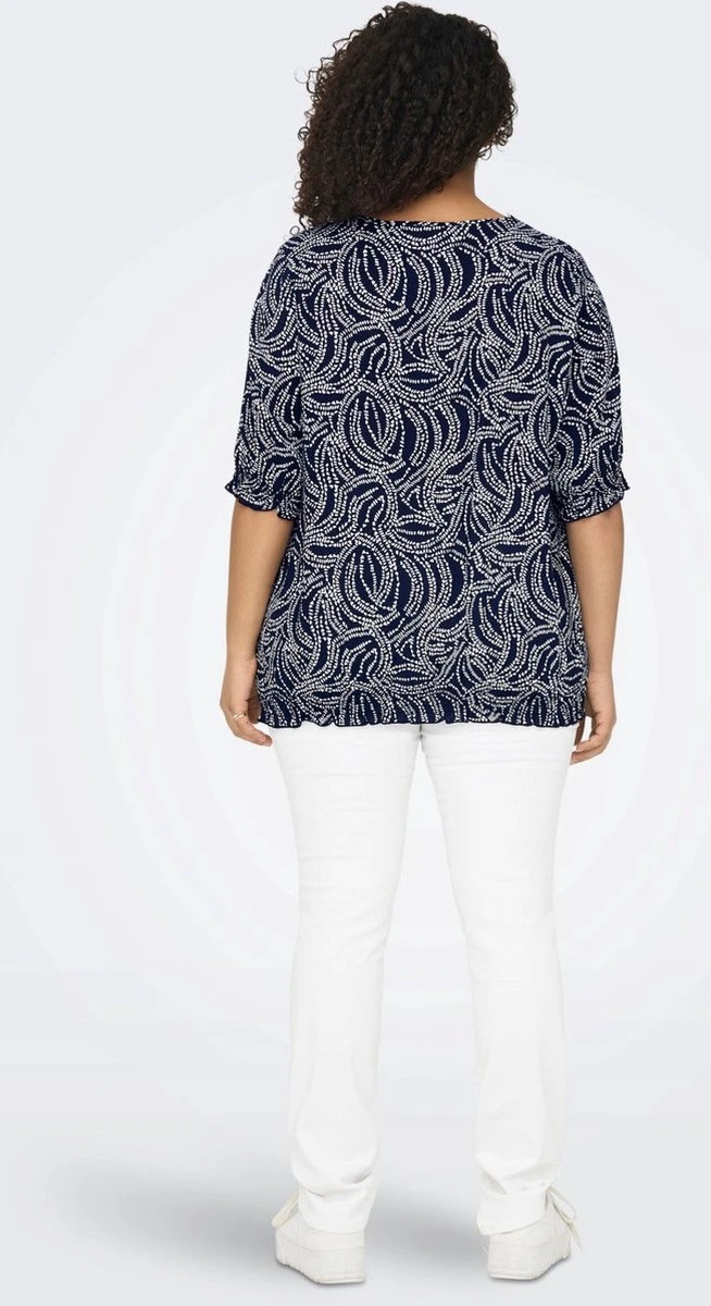 Blauw chique top met elastische mouw. Een ronde hals die iets in een V overloopt. Afgewerkt met zowel aan de mouw als onderaan de top een speelse rand.