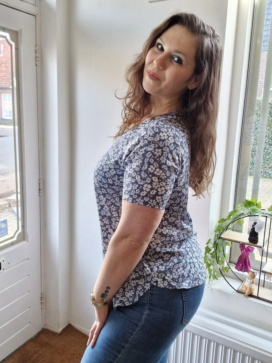 Gebloemde top met split aan de zijkant. Korte mouwen en een ronde hals. Erg leuke print voor het voorjaar of in de zomer. Aan de achterkant valt deze top een beetje langer dan aan de voorkant.