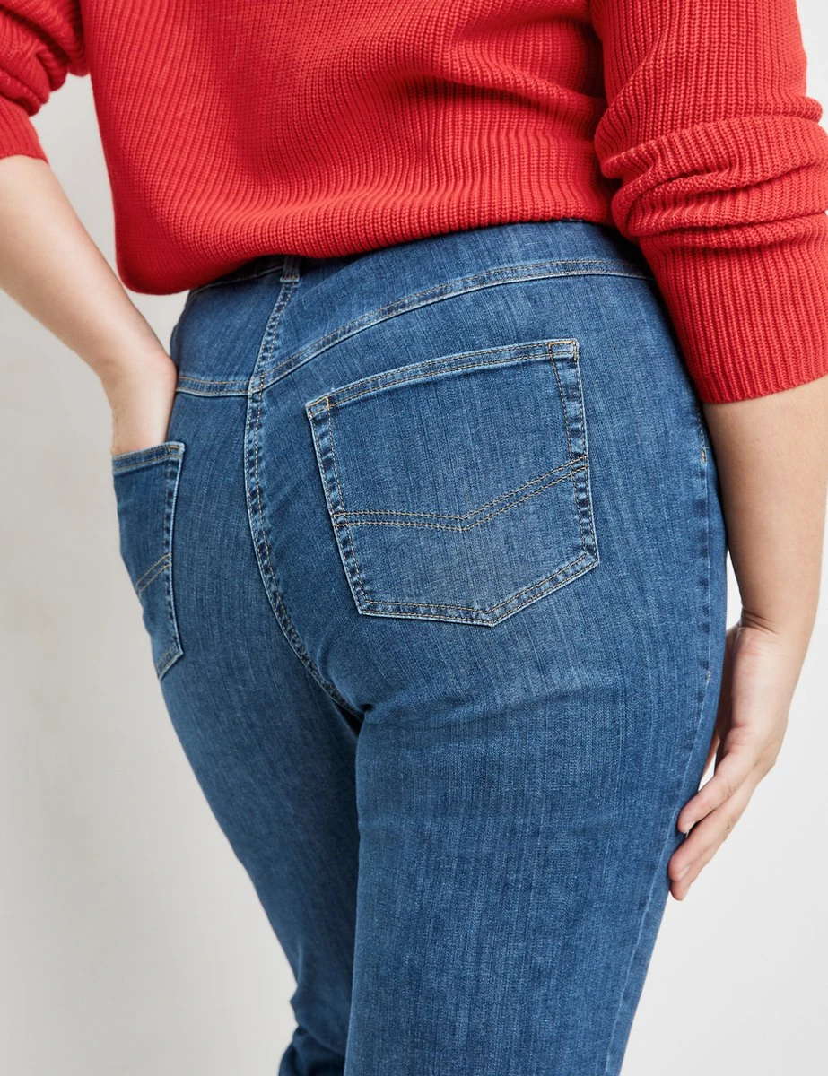 Maakt jouw vrijetijds-outfit compleet en mag in geen garderobe ontbreken: dankzij deze 5-pocket-jeans kun je verschillende, stylishe outfits creëeren. Het katoen met stretch geeft de 5-pocket-jeans een comfortabel draagcomfort. Stijlvolle details in het ontwerp, zoals verticale, ietwat schuine zakken, maken het ontwerp helemaal af. Wees steeds modisch op de hoogte met deze 5-pocket-jeans met iets kortere pijpen.