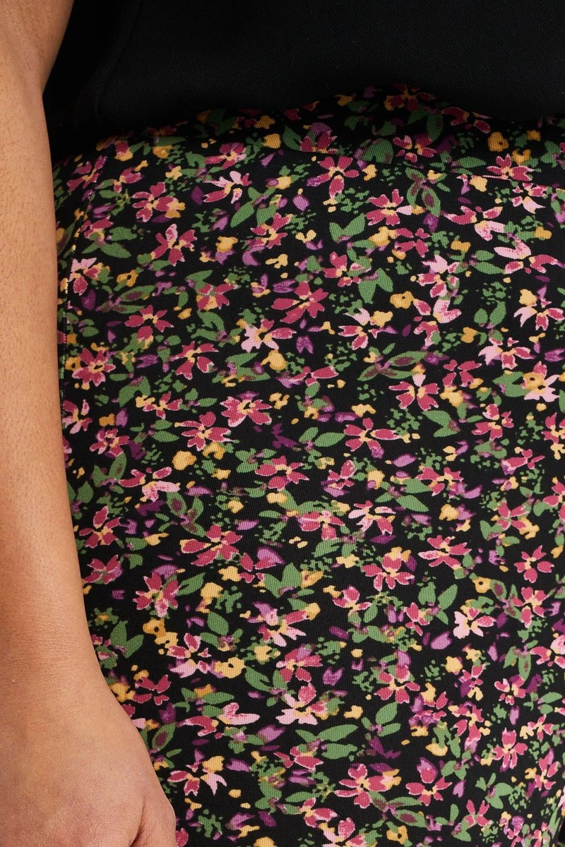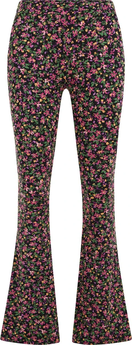 Een nauwsluitende legging van jersey-kwaliteit met een dessin. Het model heeft wijduitlopende pijpen en een elastische taille.