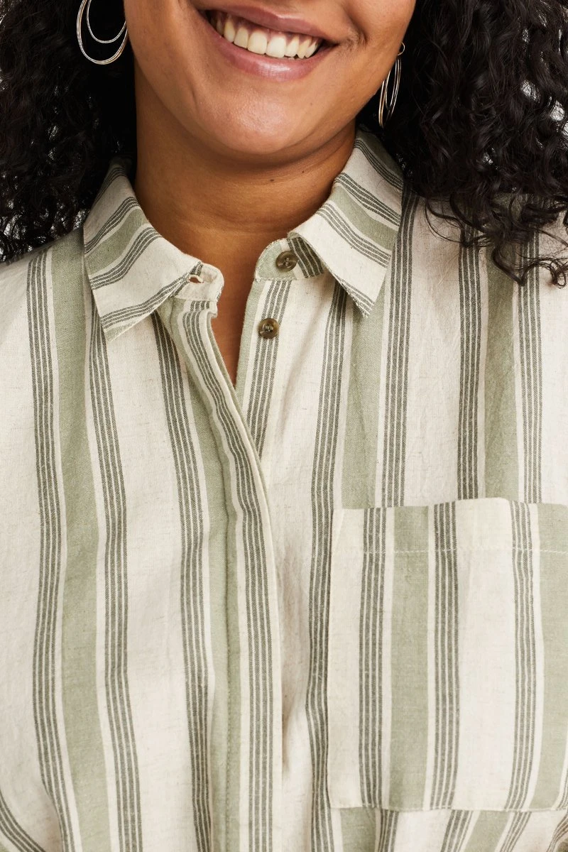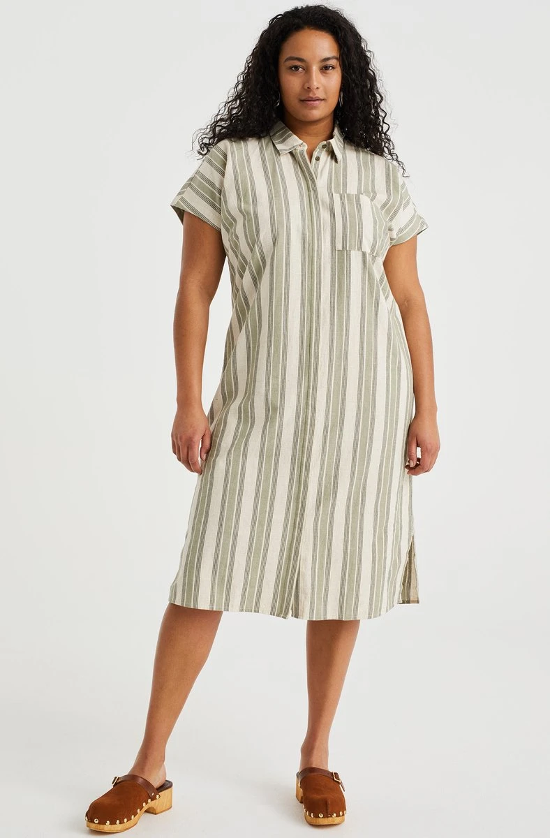 Een regular fit jurk van linnenmix met een streepdessin, blinde ritssluiting en een borstzak. Het model heeft een rechte pasvorm, korte mouwen en een normale kraag.