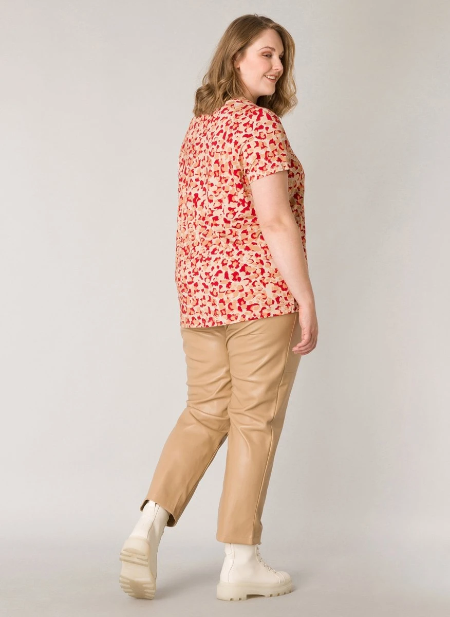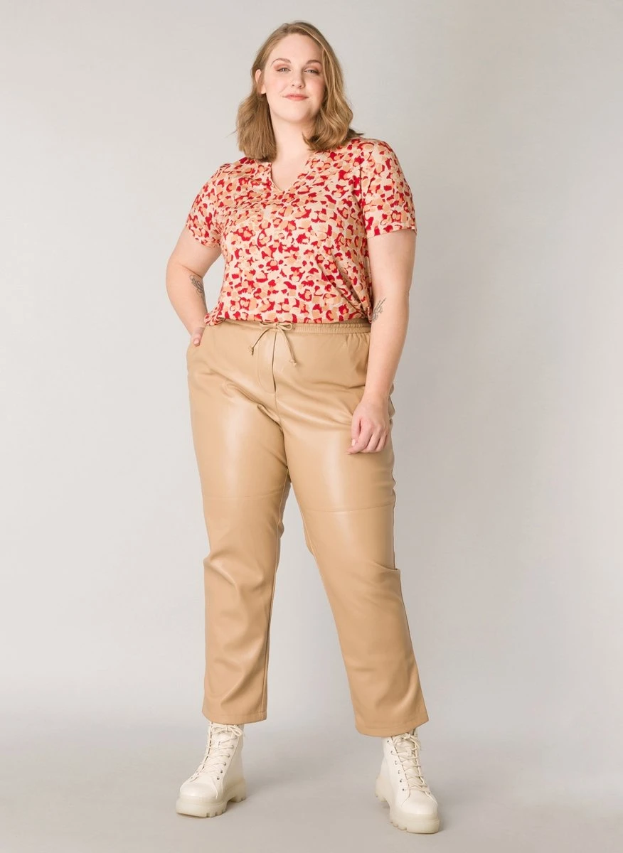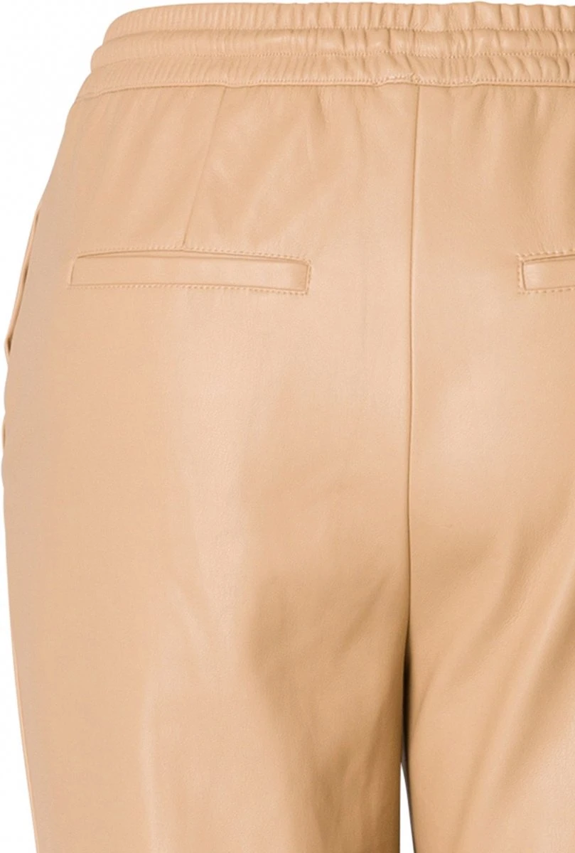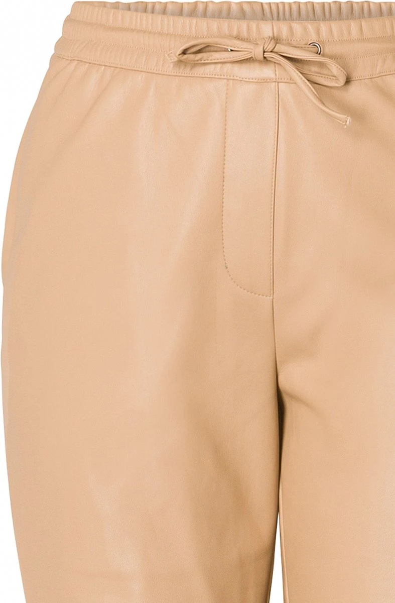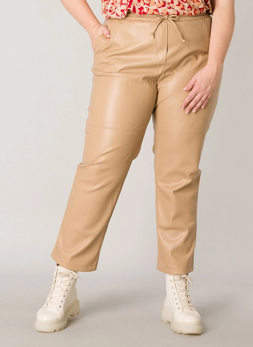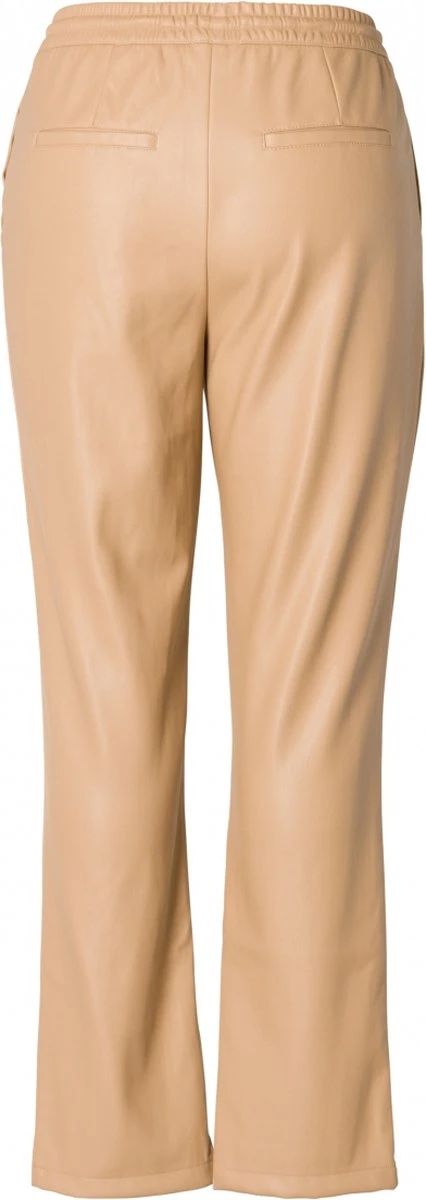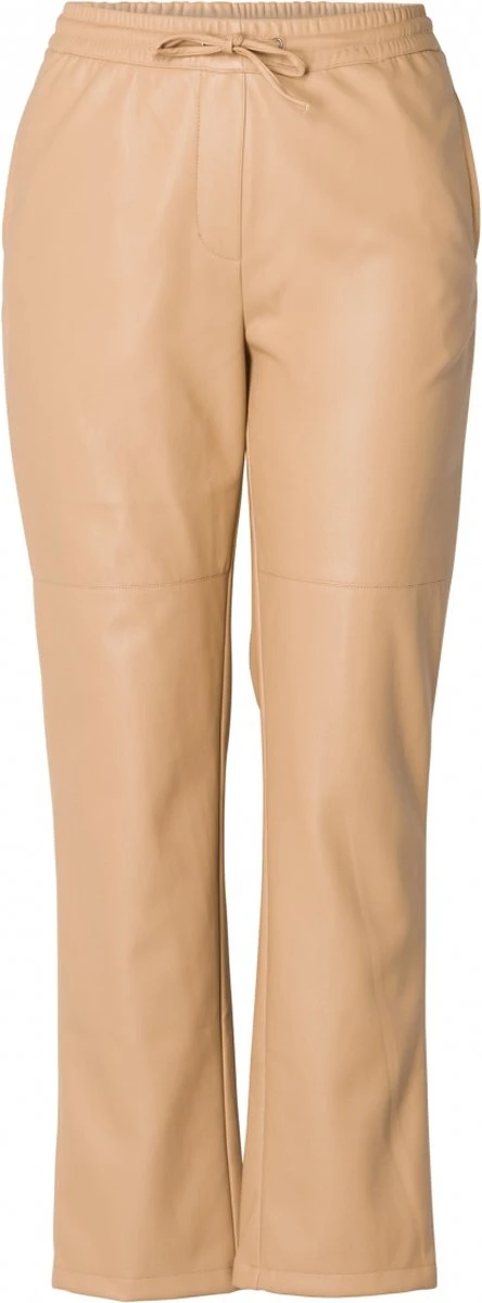 Pantalon van Yesta in een superzachte imitatielederen stof. Deze PU broek heeft een comfortabele elastische boord welke met een koordje aangesnoerd kan worden. Fijne steekzakken in de zijnaad en een horizontaal dubbel stiksel over de knie.