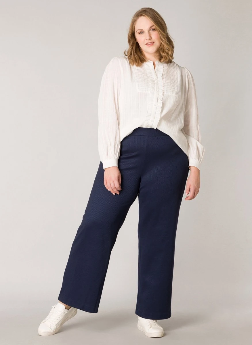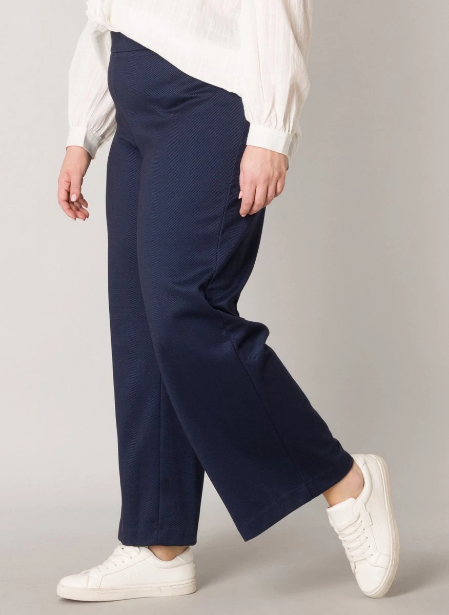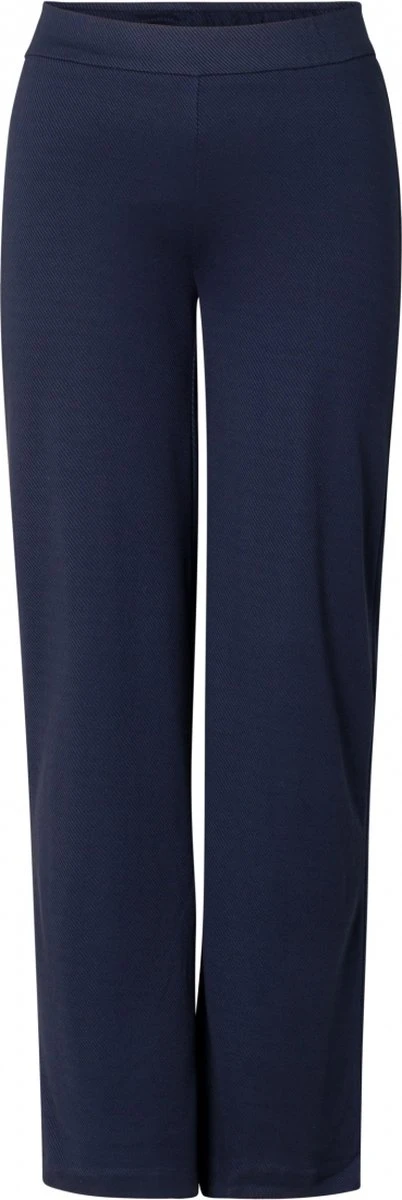 Wide-leg trousers in a polyester blend with an elasticated waistband and closed welt pockets at the back. The fabric has a diagonal slightly ribbed structure and is softly shiny. Available in deep blue.