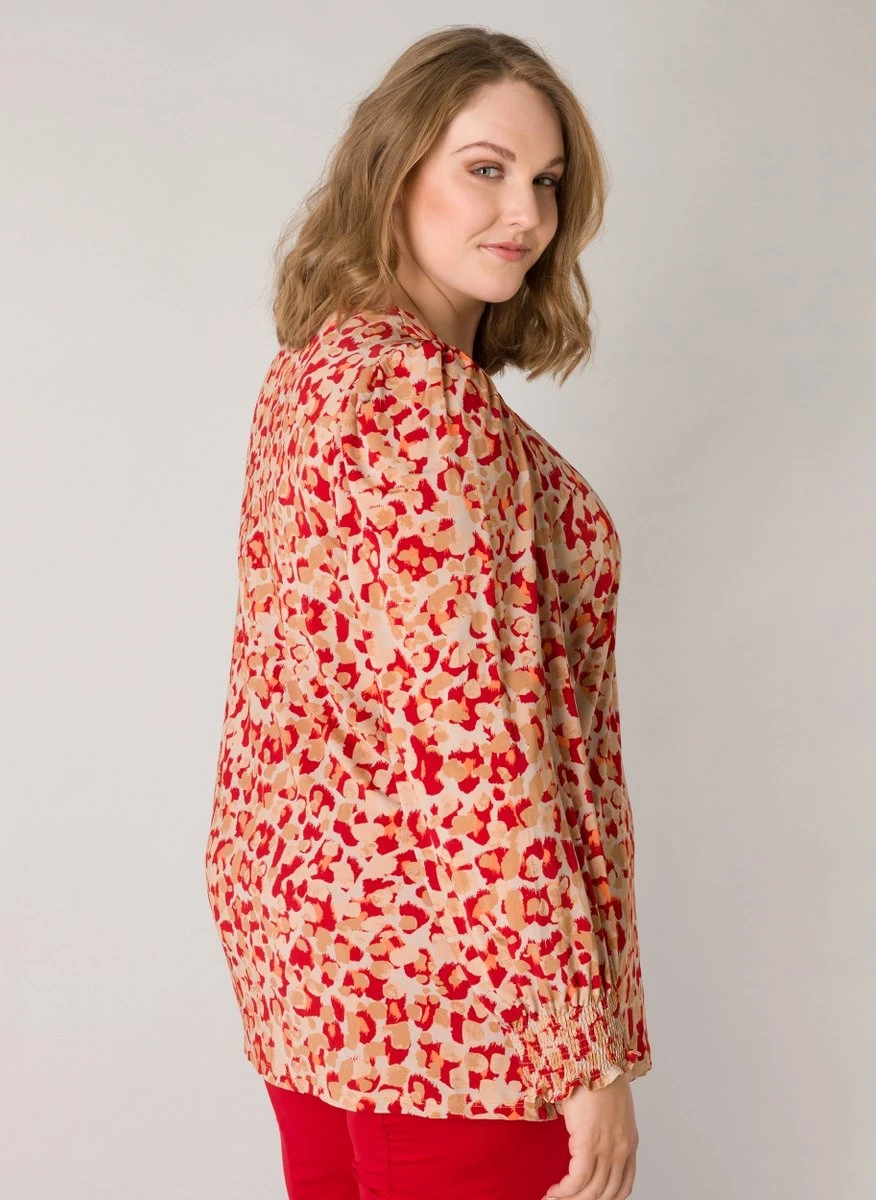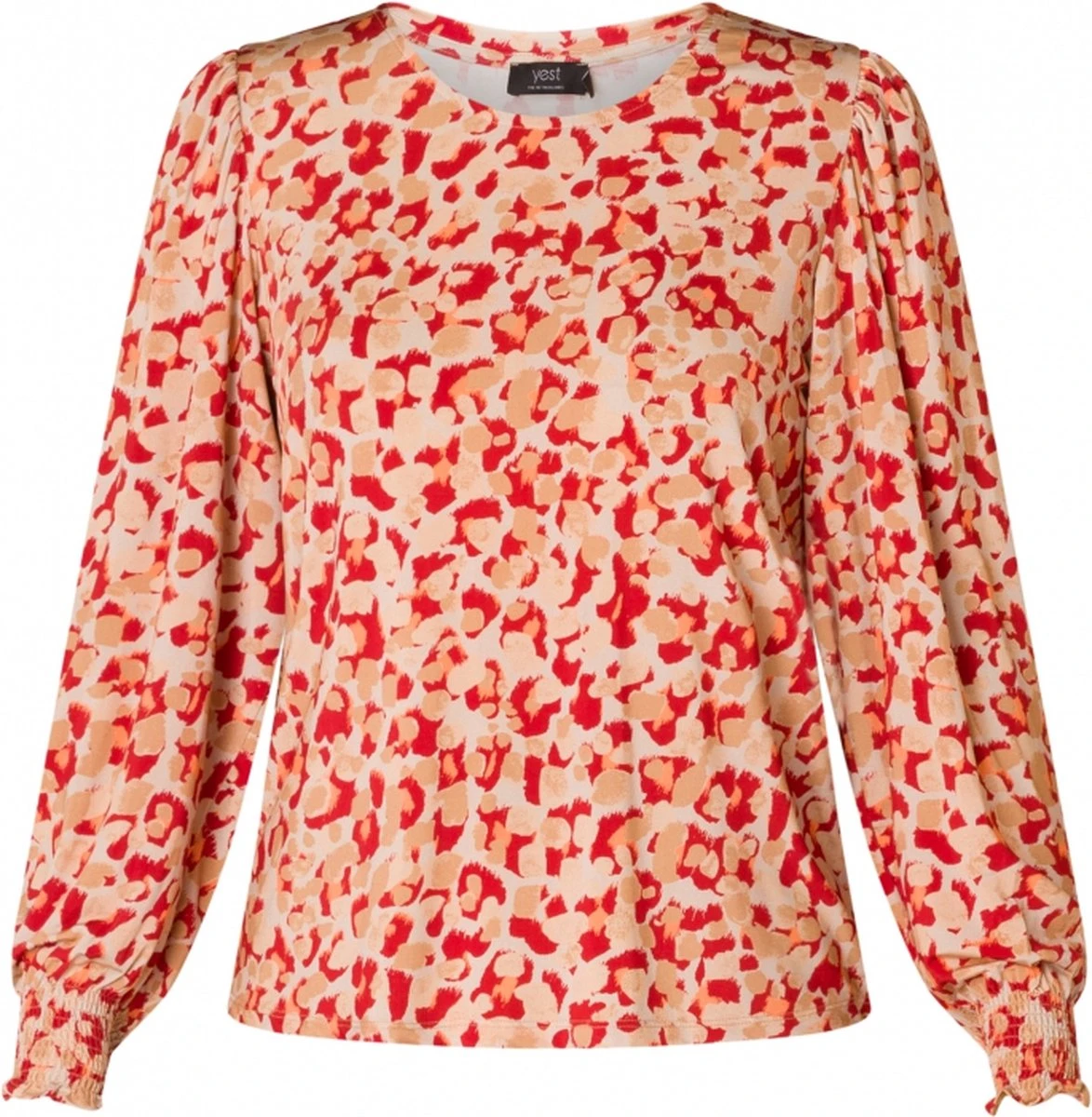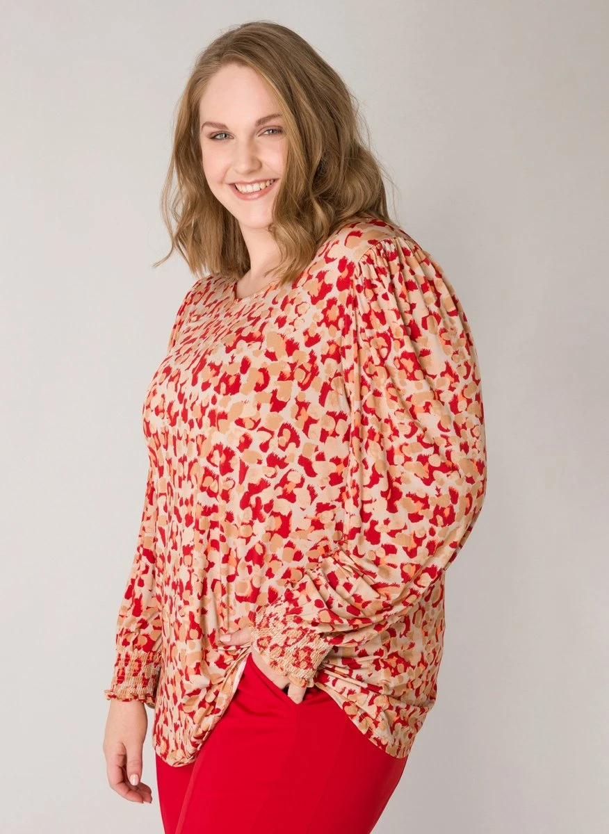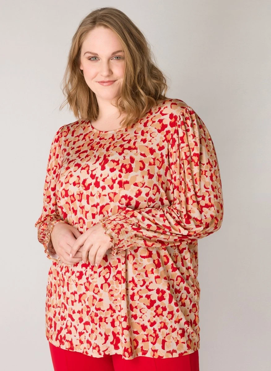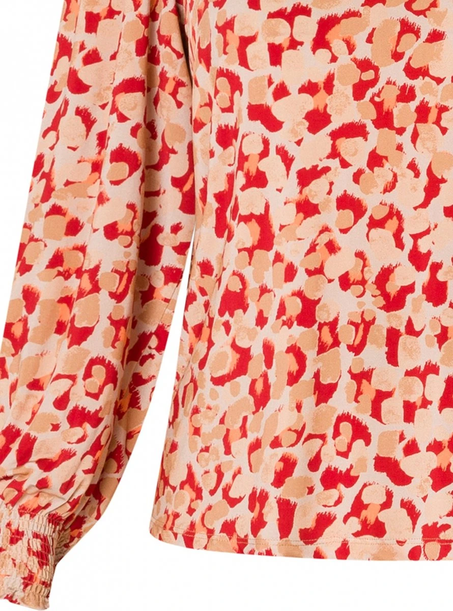 Jersey top in een rood-camel animalprint.Dit shirt van zachtglanzende kwaliteit heeft plooien op de schouders en een gesmockte manchetboord.
