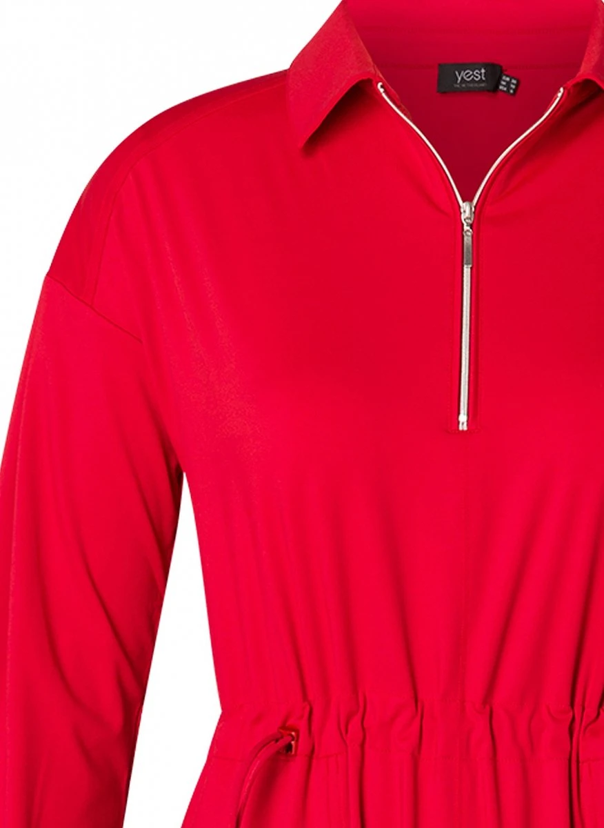Sportief jurkje in een zachte travelstof in de kleur hot red. Dit jurkje heeft een kraagje en een sluit met een rits. De mouwen zijn lang en hebben een boord. Dit item heeft verder In de taille een drawstring en heeft fijne steekzakken.