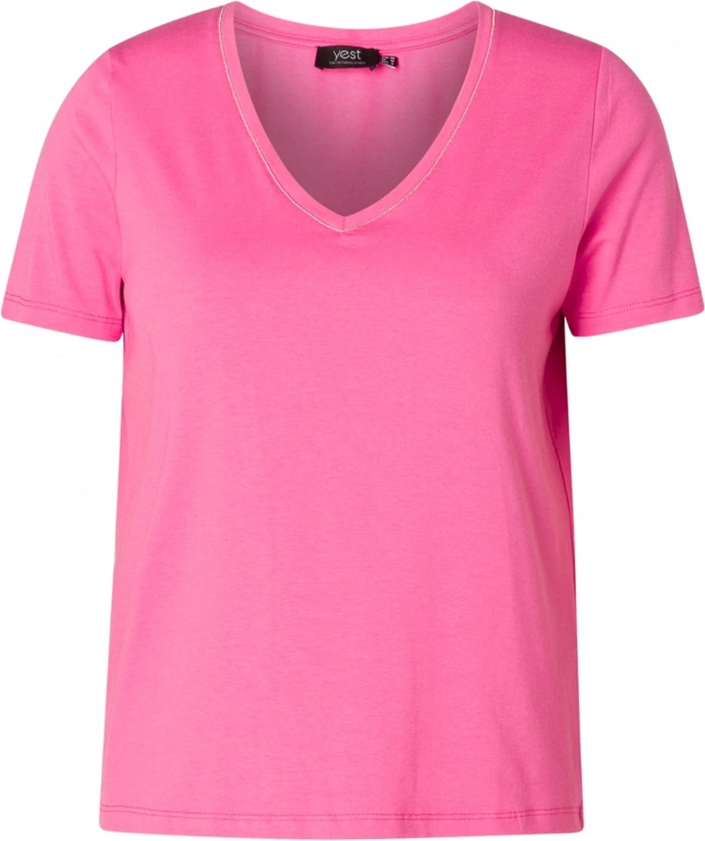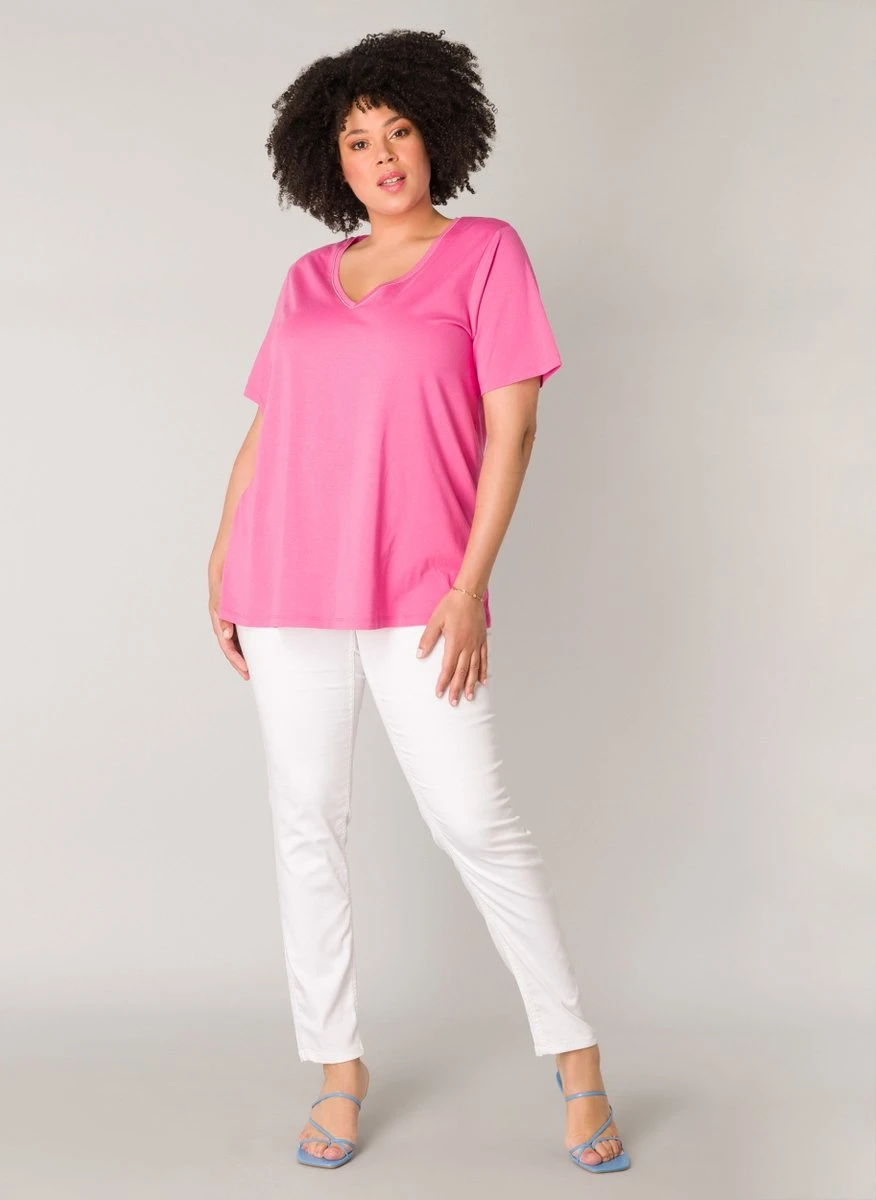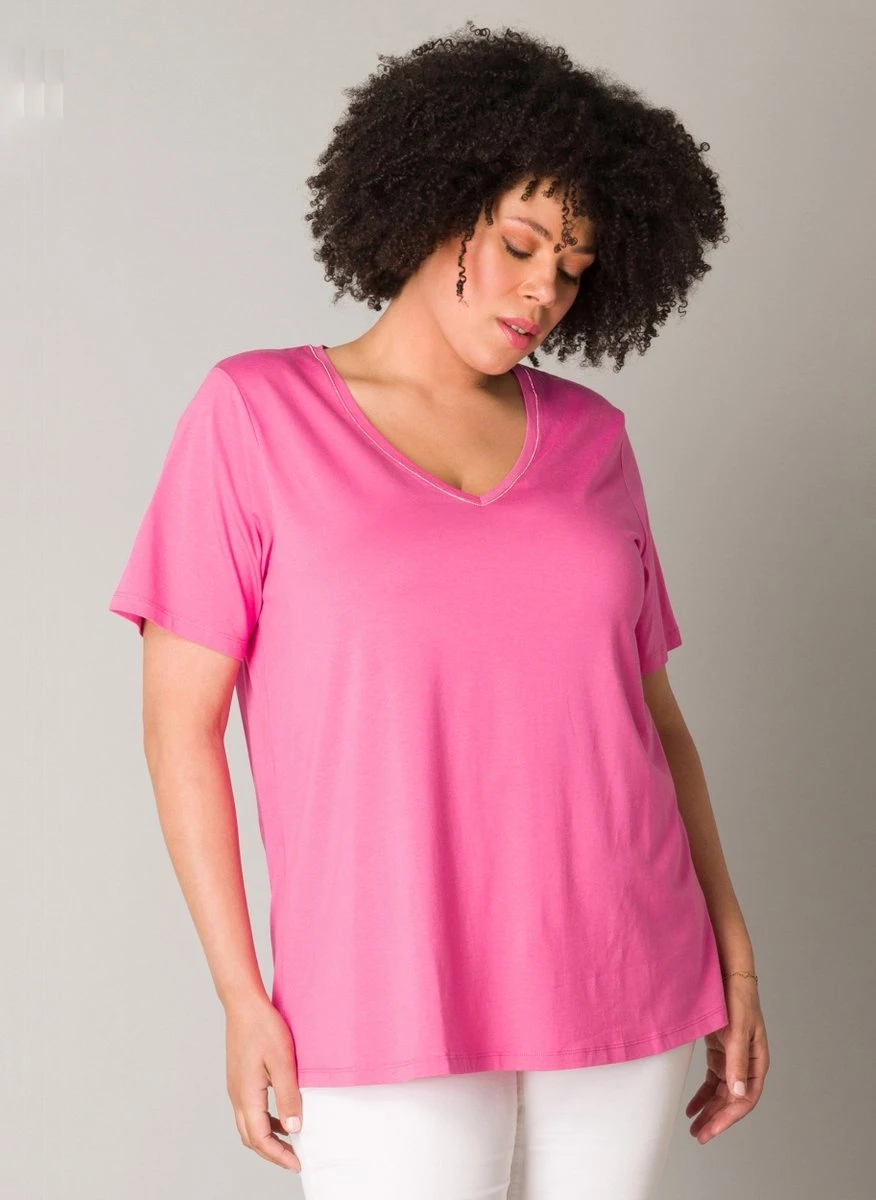 T-shirt in een zachte modal-katoen uitvoering. Dit t-shirt heeft een V-halslijn afgezet met een zilverkleurig lurexdraad. Regular fit en verkrijgbaar in de kleur fresh fuchsia.