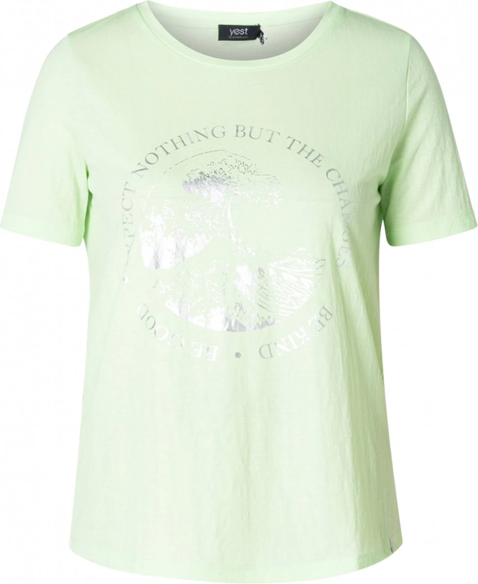 T-shirt van Yesta met een zilverkleurige print. Dit t-shirt in een katoen/modal mix heeft een ronde halslijn en korte mouwen. Verkrijgbaar in pistacchio green.